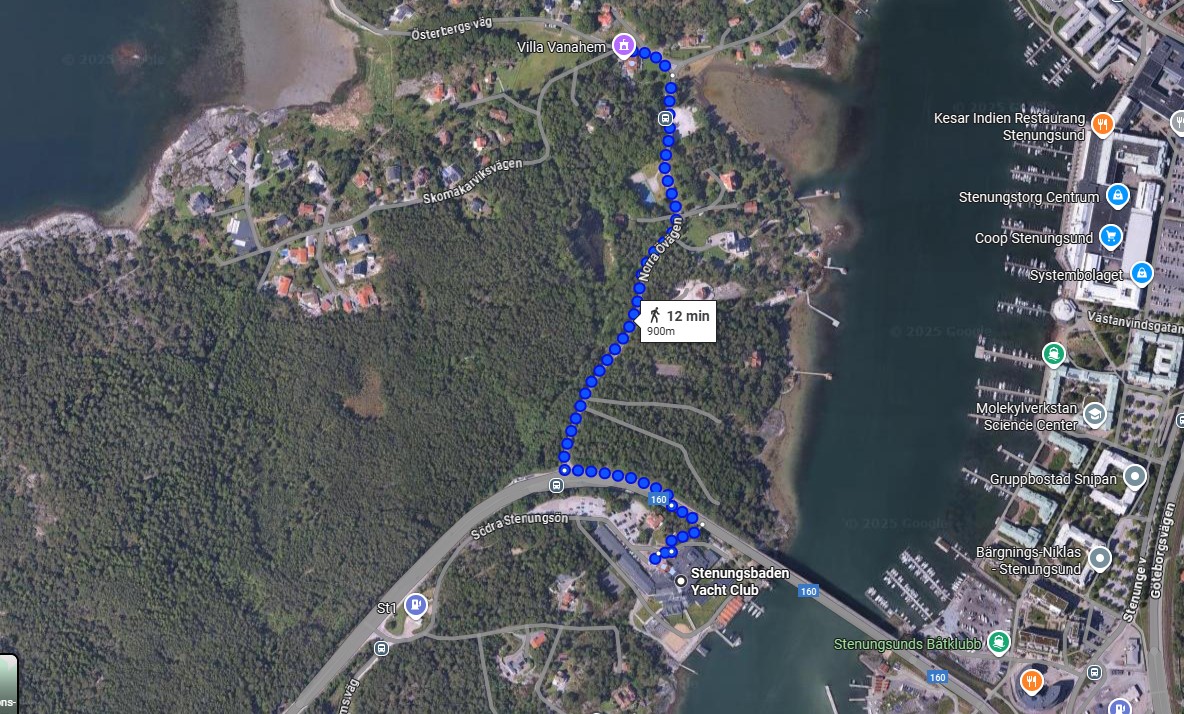 Adressen er Österbergs väg 1. Gå til parkeringen og ta snarvei ned til hovedveien på nedsiden av perkeringen. Kryss veien og fortsett ned Norra Övägen. Følg veien nedover til det kommer en liten parkeringsplass på høyre side. Villa Vanahem ligger da på venstre side etter parkeringen. Det er i underkant av 1 km.
